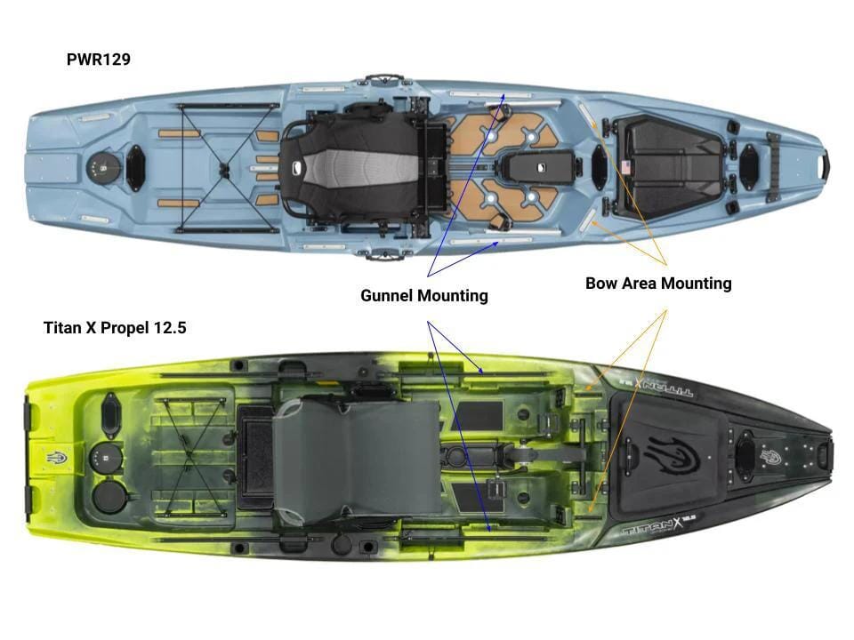 - Additional Note regarding the Titan X and PWR Mounting: The 26" and the 32" will both fit on the Titan X in the bow mounting area and across the gunnel. If you are using a Pedal Drive you will want to mount in the bow area. For the PWR, both sizes will fit on the bow mounting area of the PWR and only the 32" will fit across the gunnel.