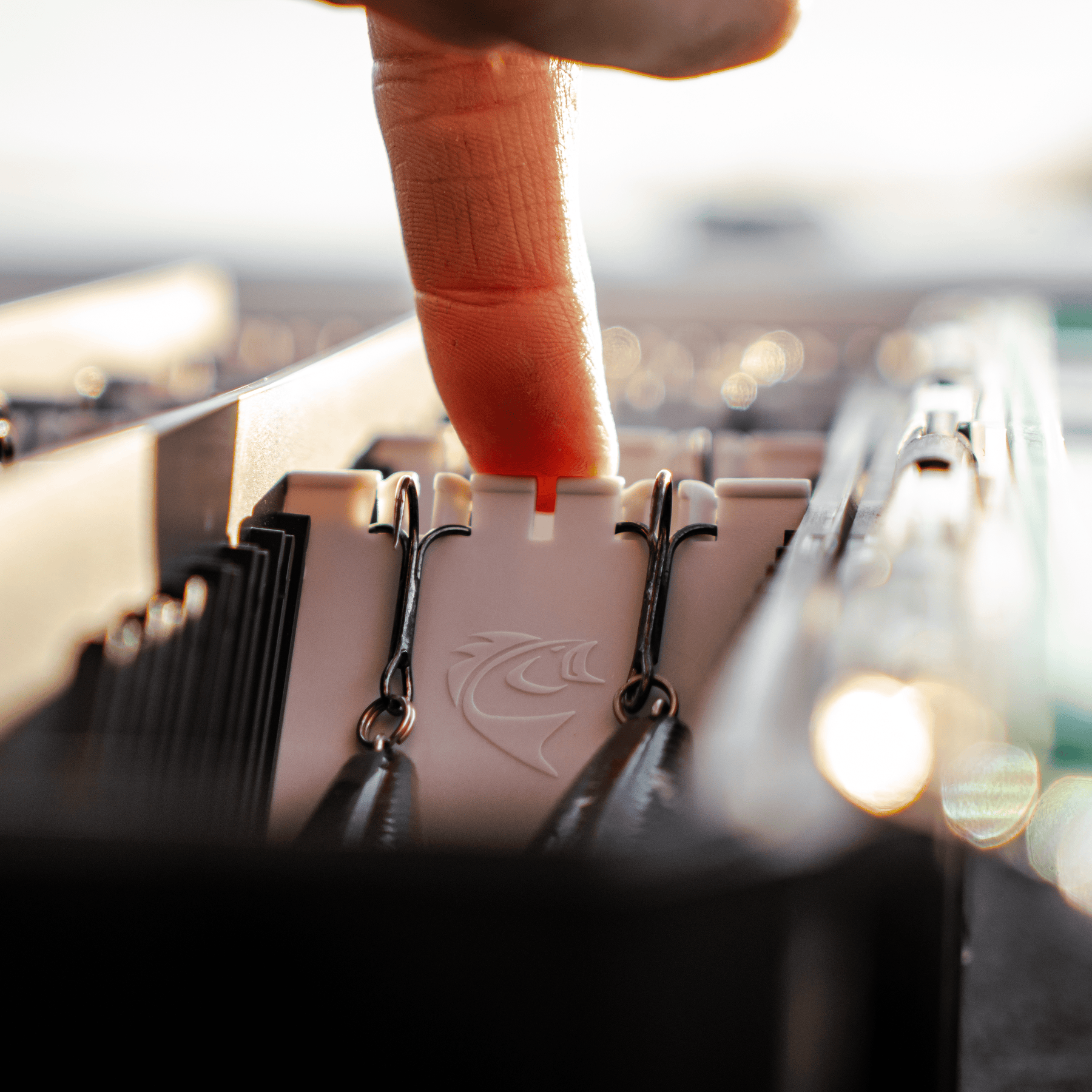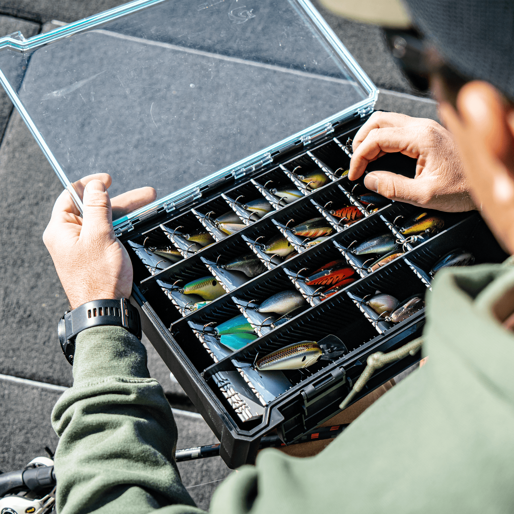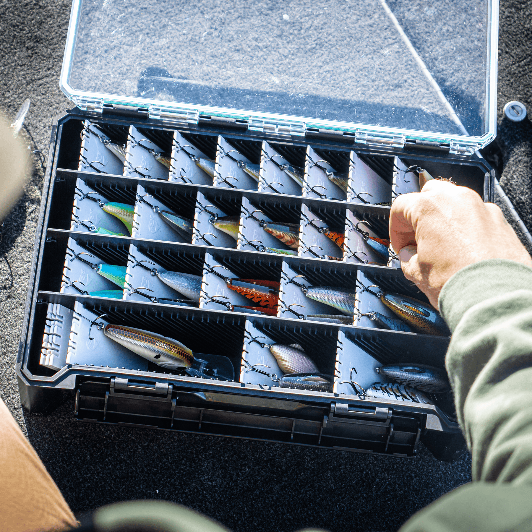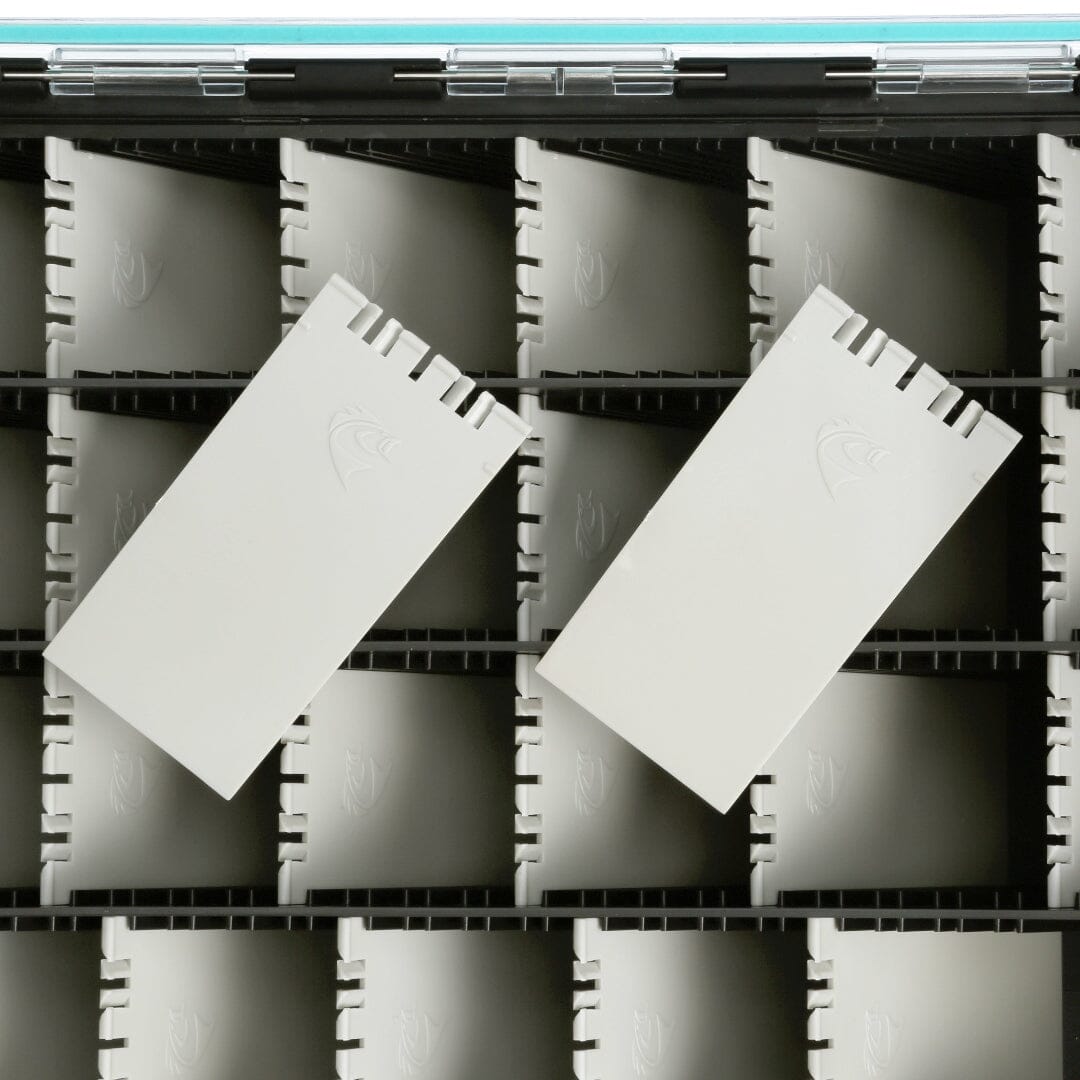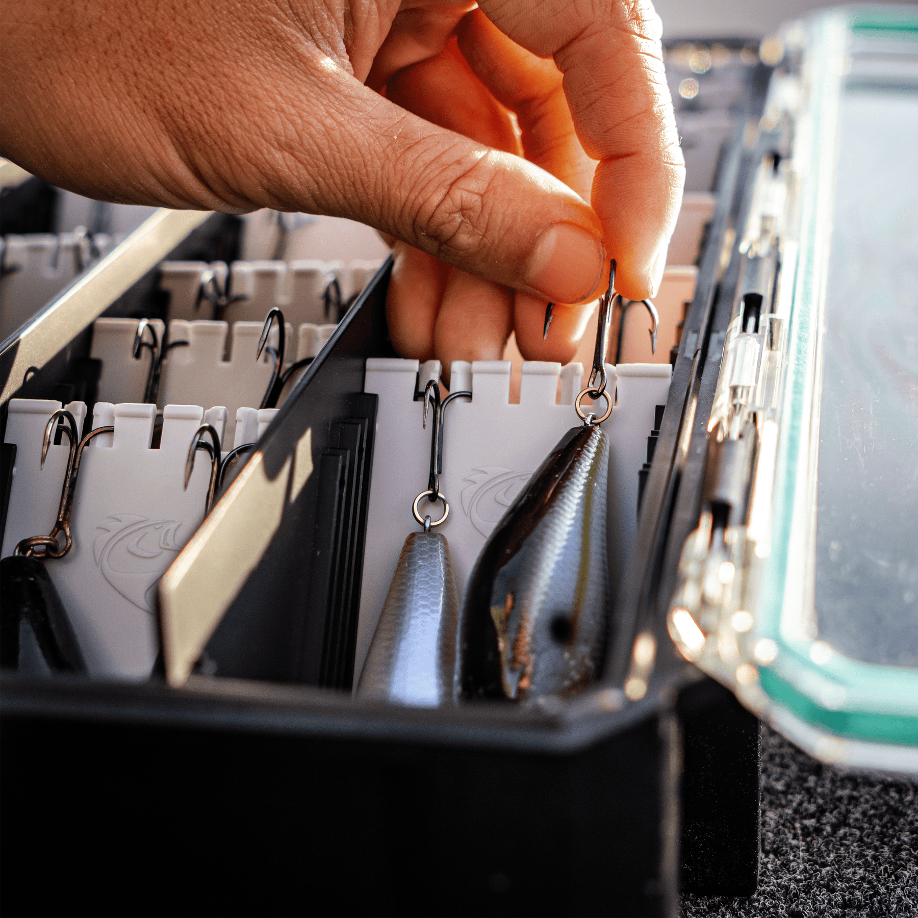 Designed to keep baits separated and organized, the Hangr also features a patent-pending Snap-N-Lock angled divider system that securely locks dividers with a snap. By storing baits at an angle, this allows for increased capacity and reduced entanglement. The Hangr’s innovative design allows for any size treble hooks to fit into the dividers while also having the ability to functionally store a large variety of baits. The snug fit notches securely hold baits in place in rough water and in all angles of storage. Comparable in size to other deep trays this box redefines bulk storage. Infinity Divider Technology gives the angler a fully customizable box ensuring that space is maximized while accounting for different sizes of lures.